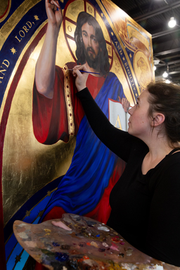 In this image of Christ the Teacher, Jesus looks directly at the viewer, with his left hand holding the Sacred Word of God and his right hand raised in blessing. In the book are the Greek letters A and O, which are short for Alpha and Omega, representing the beginnings and ends. He is dressed in the traditional garb of tunic and cloak. His cloak will be dark blue, signifying the mystery of His divine life. His tunic is a bright crimson red, symbolizing the human blood shed for us all. The garments of the Messiah in (Isaiah 63:1-4) were red, as was the soldier’s cloak put on Jesus’ shoulders during his passion (Matthew 27:28).